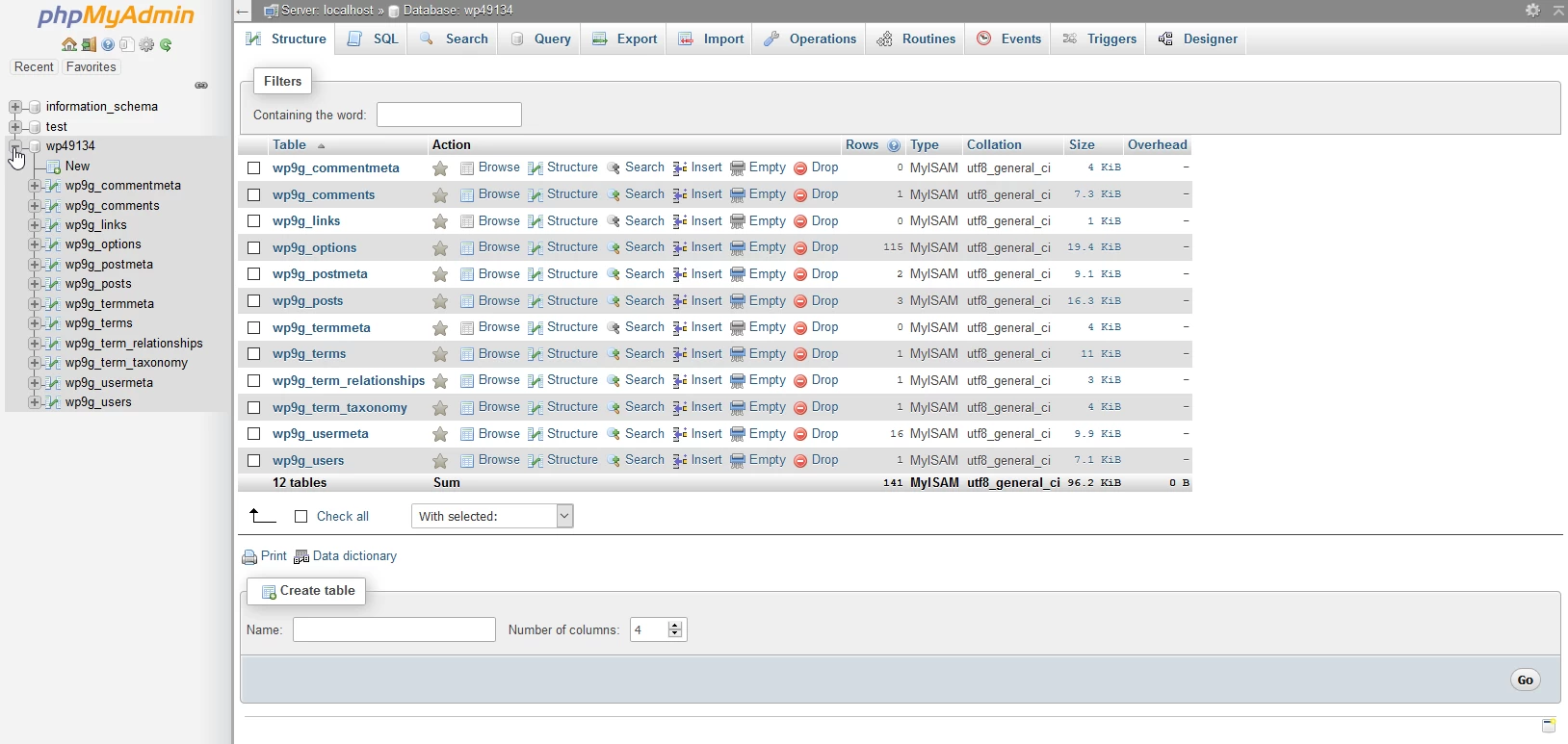 - Webuzo are aplicația PhpMyAdmin preinstalată în panou. Acestă aplicație ne permite vizualizarea grafică a bazei de date.