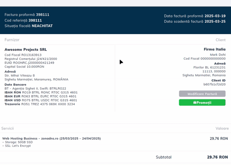 Accesați contul de client Hostico și navigați către secțiunea Financiar. Deschideți factura proformă asupra căreia doriți să aplicați cuponul.