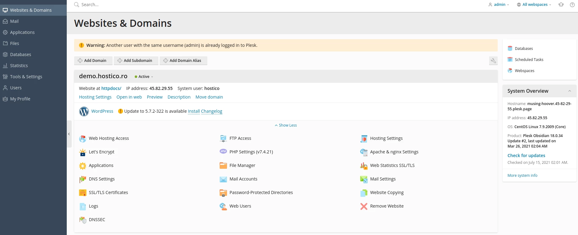 - Dacă procesul de autentificare a fost realizat cu succes, se va deschide pagina cu panoul de control Plesk a găzduirii respective.