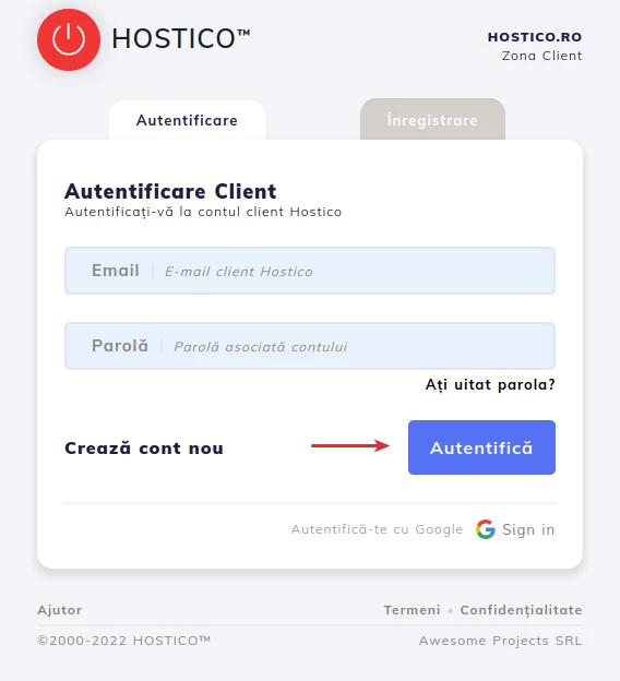 Notă: Dacă nu vă mai amintiți parola necesară pentru autenficarea în cont, accesați tutorialul Regenerare parolă cont client Hostico în vederea vizualizării pașiilor necesari regenerării parolei.