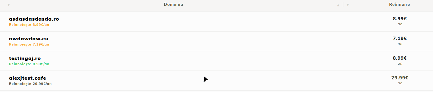 - Vă apar domeniile pe care le dețineți la Hostico. Puteți vedea denumirea, starea, perioada rămasă activă şi costul reînnoirii.