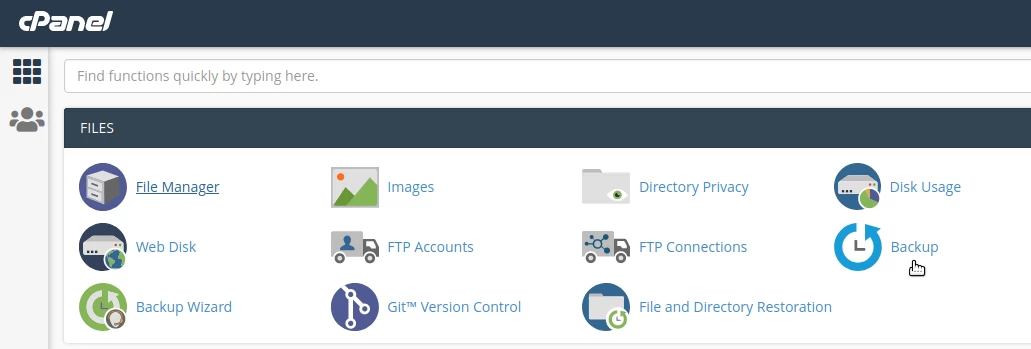 • După autentificarea în panoul de control cPanel, în interfaţa ce se va afişa, căutăm secţiunea “Files” iar acolo selectăm "Backup"