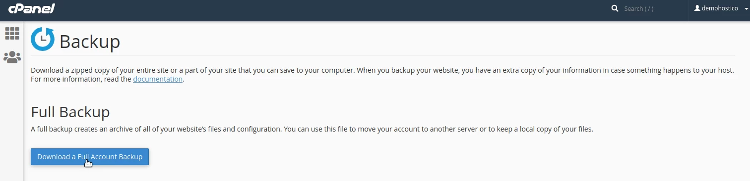 • De sub interfața Backup vom face click pe Download a Full Account Backup