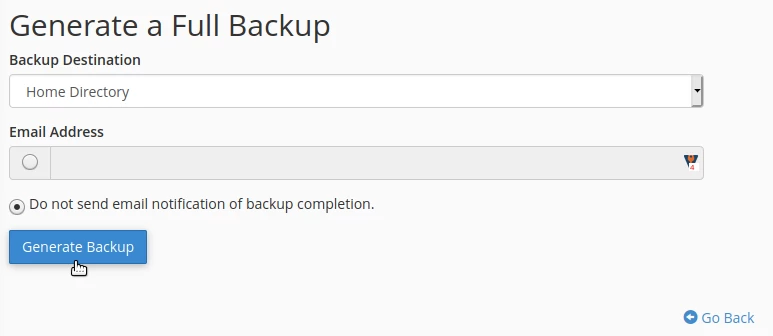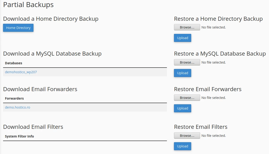 • Această opțiune va crea o arhivă cu totalitatea fișierelor și configurărilor contului pentru a putea fi salvate, însă de sub interfața cPanel această arhivă nu se poate folosi pentru restaurarea totală a unui site. Pentru o restaurare totala va trebui sa ne contactați prin e-mail pe: tehnic@hostico.ro